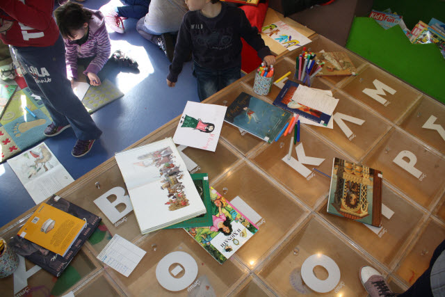 Μελετώντας βιβλία από τη συλλογή της παιδικής γωνιάς ανακαλύπτουμε την συναρπαστική ιστορία της γραφής και τη γοητεία των διαφορετικών αλφαβηταριών στον κόσμο και δοκιμάζουμε να γράψουμε σε διάφορες γλώσσες και με διαφορετικά υλικά.